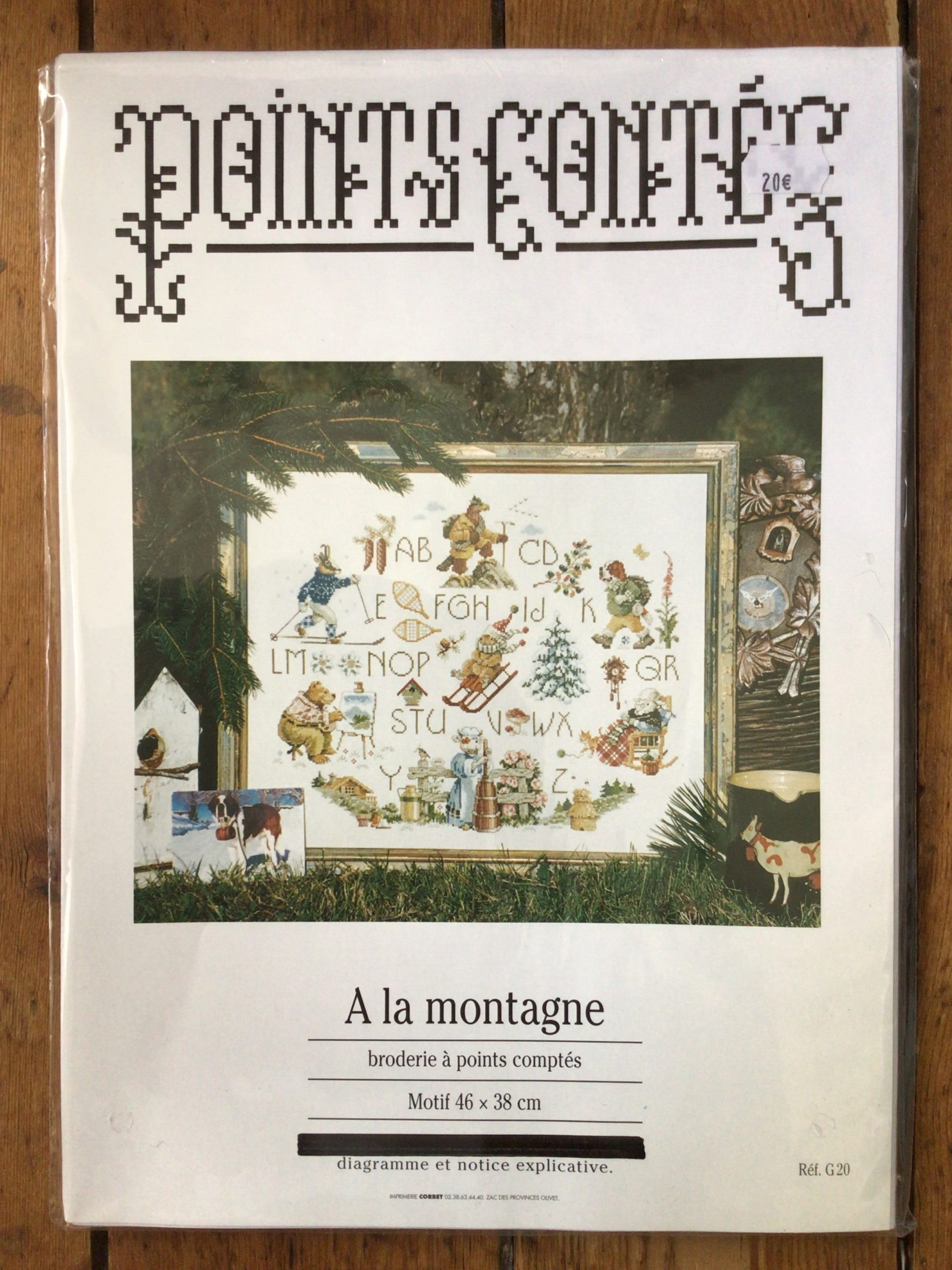 Charmant abécédaire où les animaux pratiquent les sports de montagne… sur toile Aida écru au point de croix compté