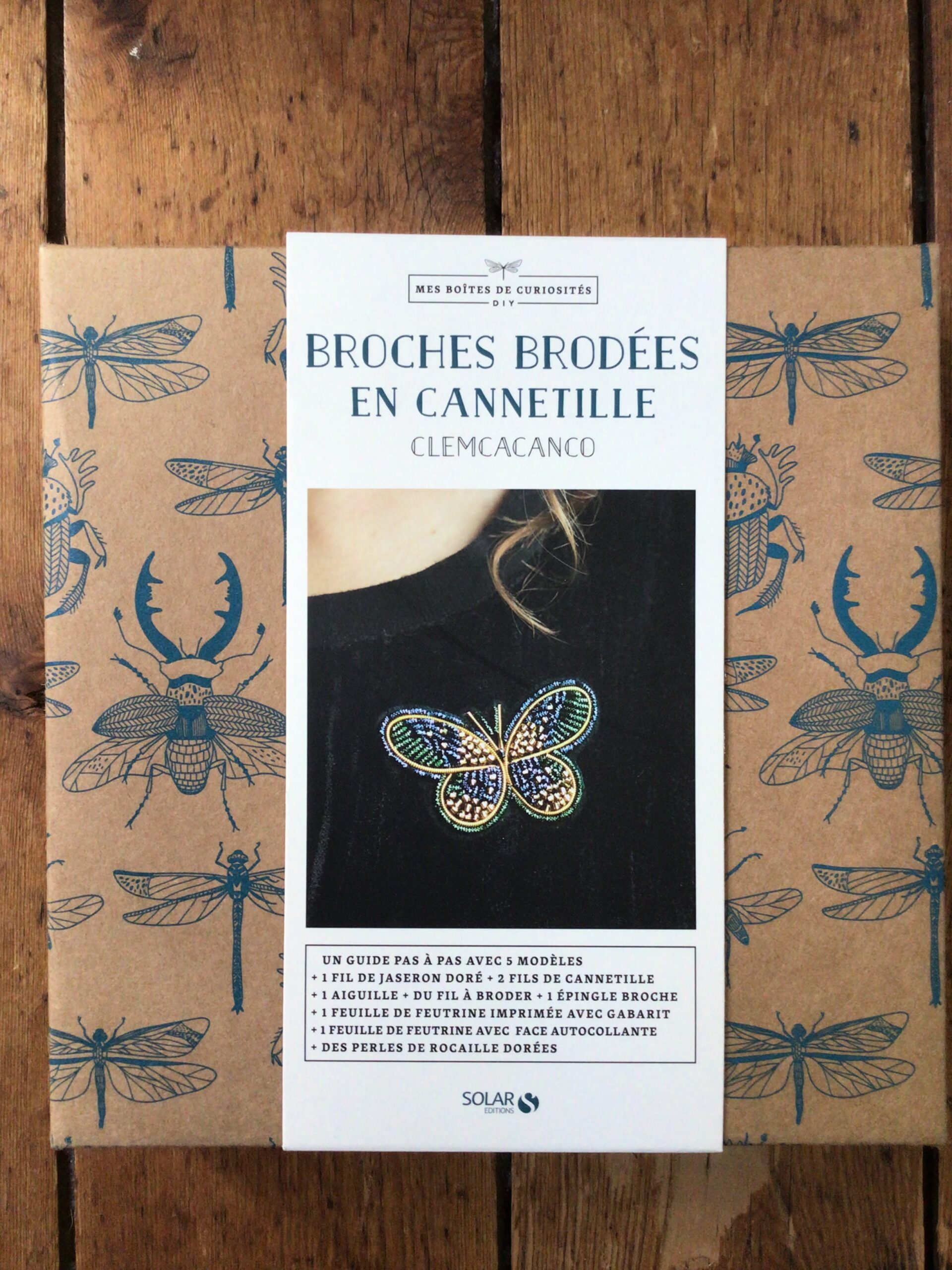Fournitures : jaseron or, cannetille bleue et verte, coupon feutrine noire, perles de rocaille dorées, fil à broder, épingle broche, livret explicatif avec 5 modèles